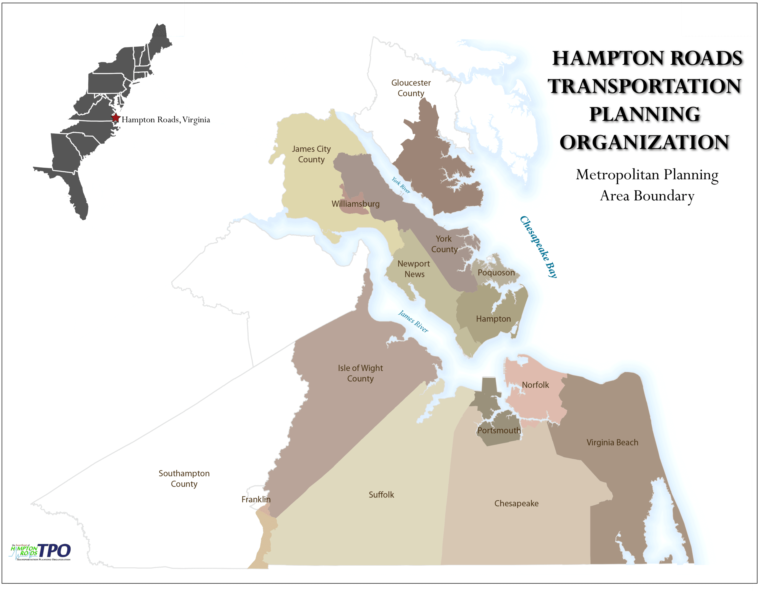 At a minimum, a Metropolitan Planning Area (MPA) must cover the urbanized area and contiguous geographic areas likely to become urbanized within the next 20 years. Currently, the cities of Chesapeake, Hampton, Newport News, Norfolk, Poquoson, Portsmouth, Suffolk, Virginia Beach, and Williamsburg; the counties of Isle of Wight, James City, and York; and a portion of Gloucester County, Franklin (city), and Southampton County are included in the MPA.